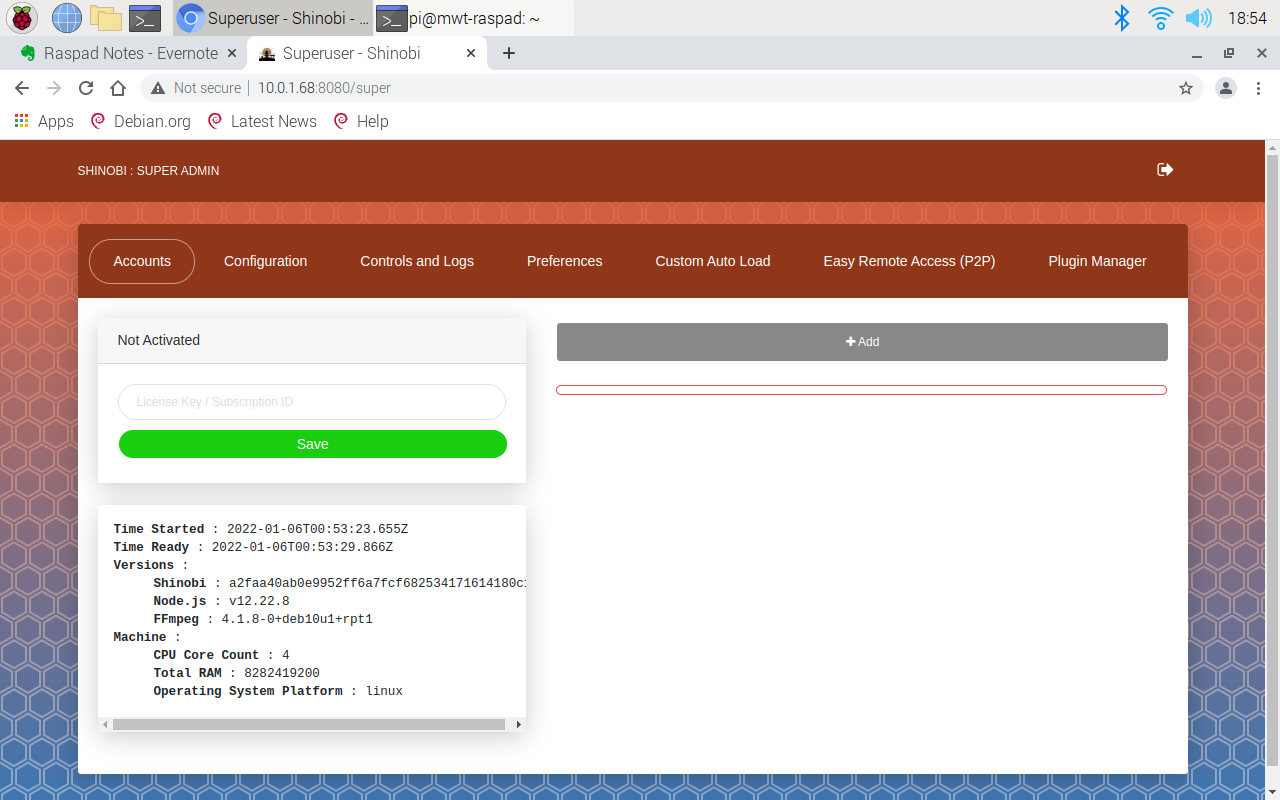http://10.0.1.68:8080/superSubstitute your IP address and ensure you have the /super on the end of the URL. If you do not, you will go into the user login screen, and the Shinobi admin username/password will not work.