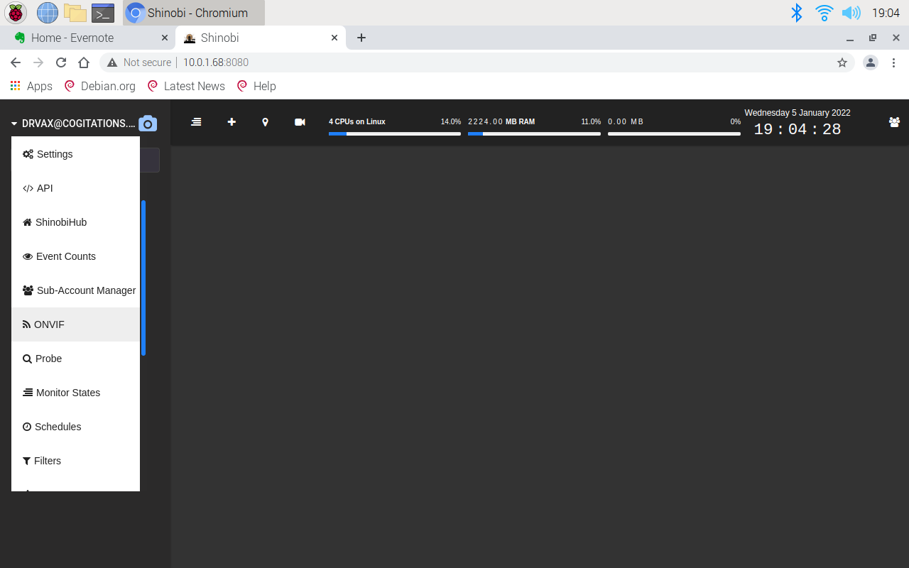 After you log into Shinobi, click on your login id, located on the top right-hand side of the website. Then, navigate down to ONVIF (Open Network Video Interface Forum). Included in the ONVIF standards is a process for discovering cameras.