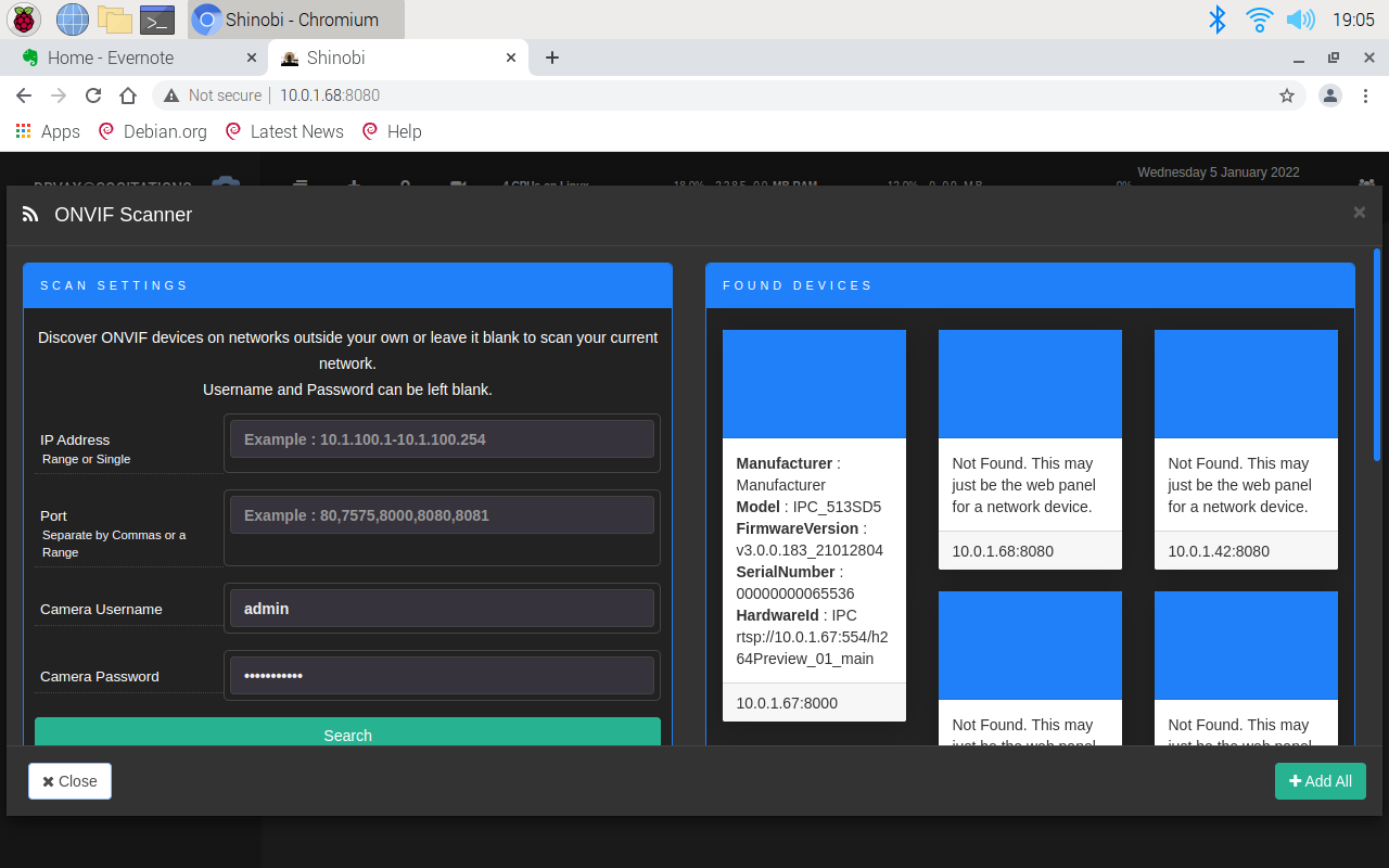 On the ONVIF page, fill in "admin" for the username and the password you assigned to your camera during the installation. A few seconds after clicking "search," you will see several "found devices." When a camera matching the username and password you provided is found, the blue topped box will contain information about the camera.