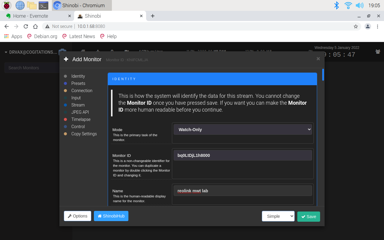 Camera feeds are displayed on "monitors" in the Shinobi application. To add a camera, you define a monitor.