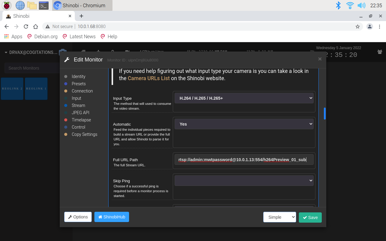 Since the images displayed are small, you can reduce the load on the Raspberry Pi by changing the feed from _main to _sub. Mouse over one of the feeds and click on the wrench, which will bring the "monitor" parameters back up. Scroll down until you see "Full URL Path" and replace the _main on the end of the URL with _sub. This will change the feed from high resolution to low resolution, sufficient for this application. It will also reduce the CPU load on a Raspberry Pi 4, for two feeds, from about 65-80% down to 40-50%.