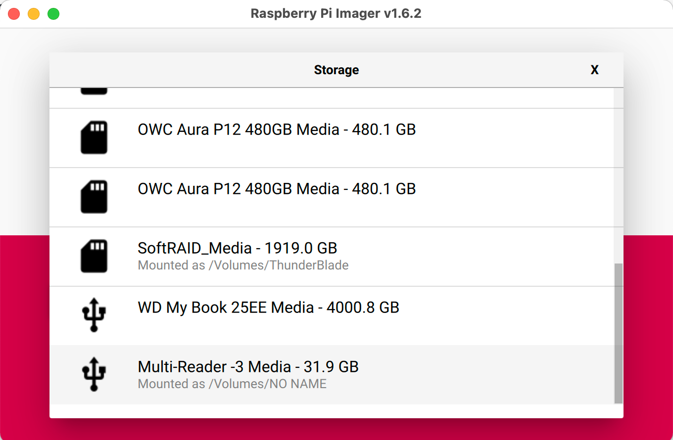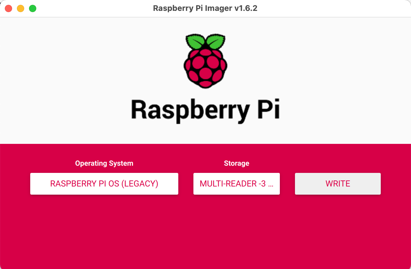 Next, put the SD card into our computer, run the program, click on "CHOOSE OS," and select Raspberry Pi Legacy (Buster) as the software to install. Again, make sure you select your SD card and not a regular hard drive, as this process will erase the selected location and put the Raspberry Pi software onto it.