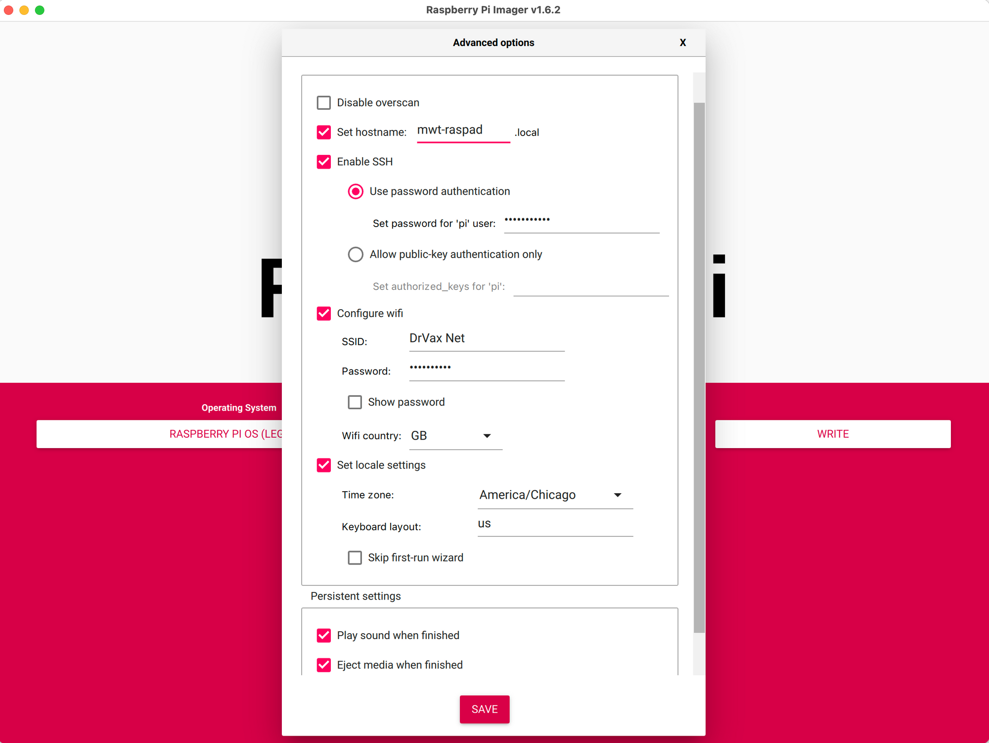 Now, before clicking on write, while the mouse is focused in the imager window, type a ctrl-command-x (on a MAC) or a ctrl-shift-x (on Windows) to bring up the advanced options. If you are on a MAC, you can decline to fill in the password from the keychain option.