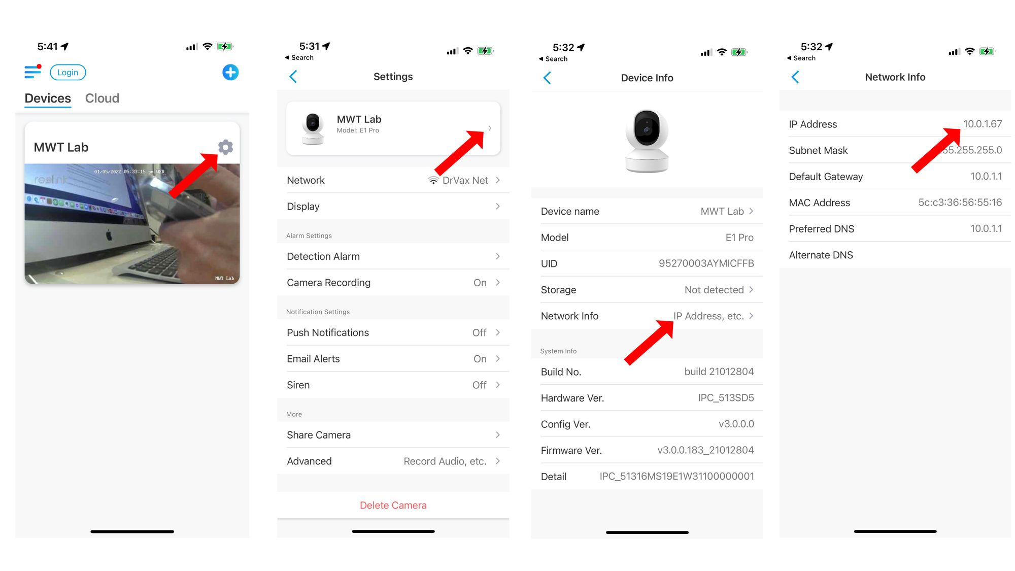 To obtain the IP address of your camera, start the APP and click on the gear next to the camera. Then click on the > next to the camera name. Then click on "IP Address, etc. >." The IP address is shown on the Network Info page. You will need this address for the next step.